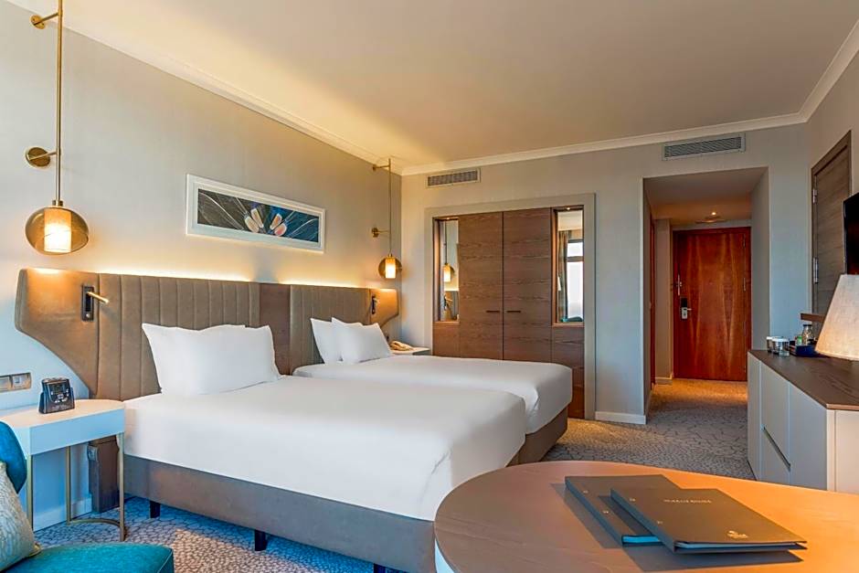 Executive benefits, desk with ergonomic chair, fridge. Enjoy this bright space with two comfortable single beds and stunning decor that emulates the relaxed Mediterranean lifestyle. A well-equipped desk, natural light, and air conditioning mean you can work in comfort. Also included with this airy room are a 42-inch HDTV, iron and ironing board, an elegant bathroom with shower, and a fluffy bathrobe.